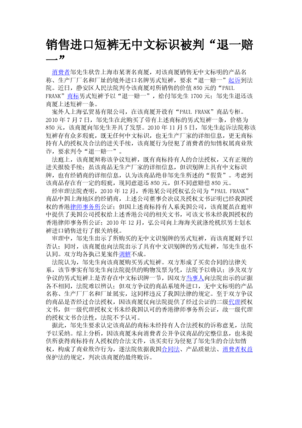 銷售進(jìn)口短褲無中文標(biāo)識(shí)被判“退一賠一”