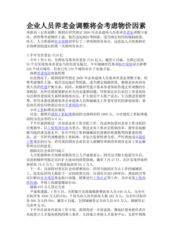 企業(yè)人員養(yǎng)老金調(diào)整將會考慮物價因素