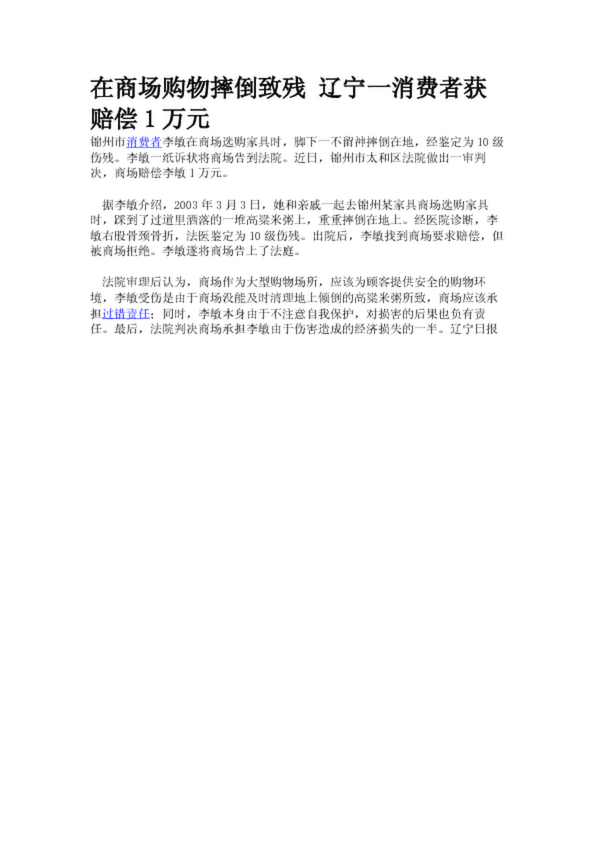 在商場購物摔倒致殘 遼寧一消費者獲賠償1萬元