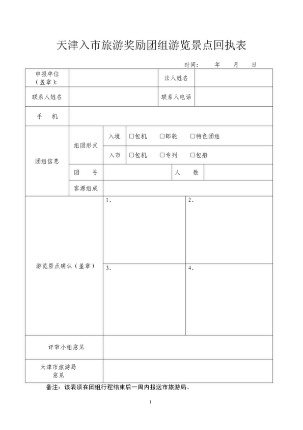 天津入市旅游獎勵團組游覽景點回執(zhí)表