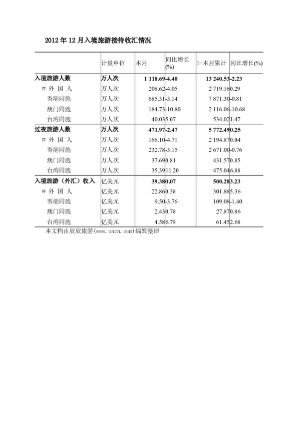 2012年12月入境旅游接待收匯情況